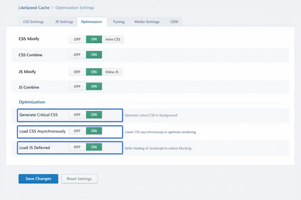 Preload critical CSS: LiteSpeed Cache’s Critical CSS feature automatically handles this through inline critical CSS and deferred full stylesheet.